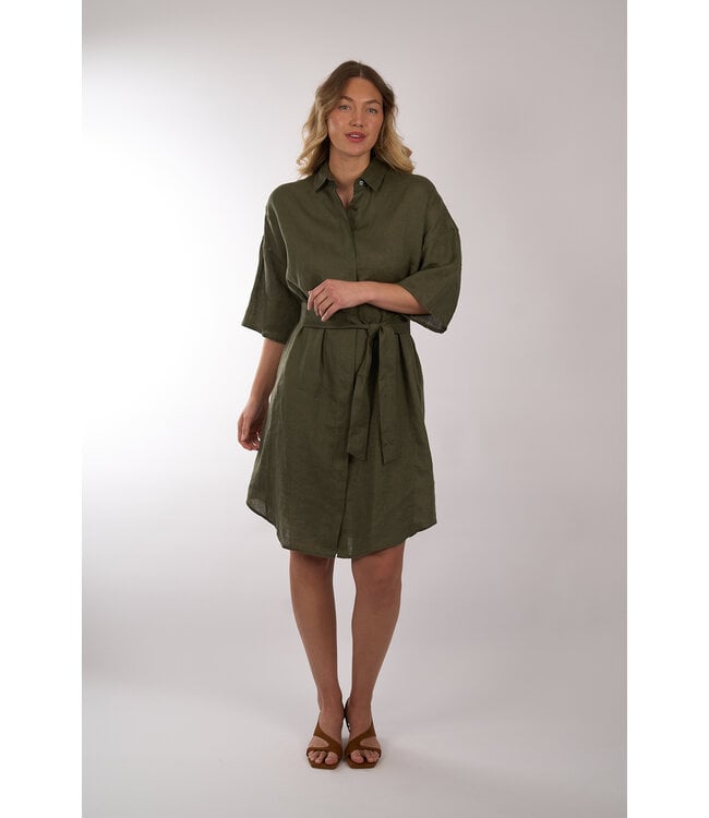 Jurk van 0039 Italy in een linnen uitvoering en een midi lengte. De jurk heeft een kraag, een doorlopende knoopsluiting en een los ceintuur om de taille te accentueren.