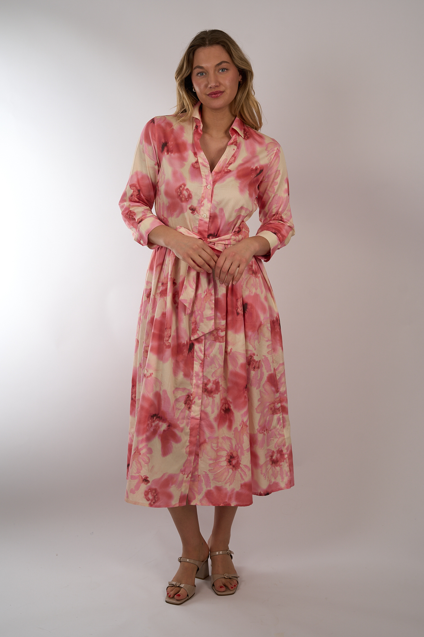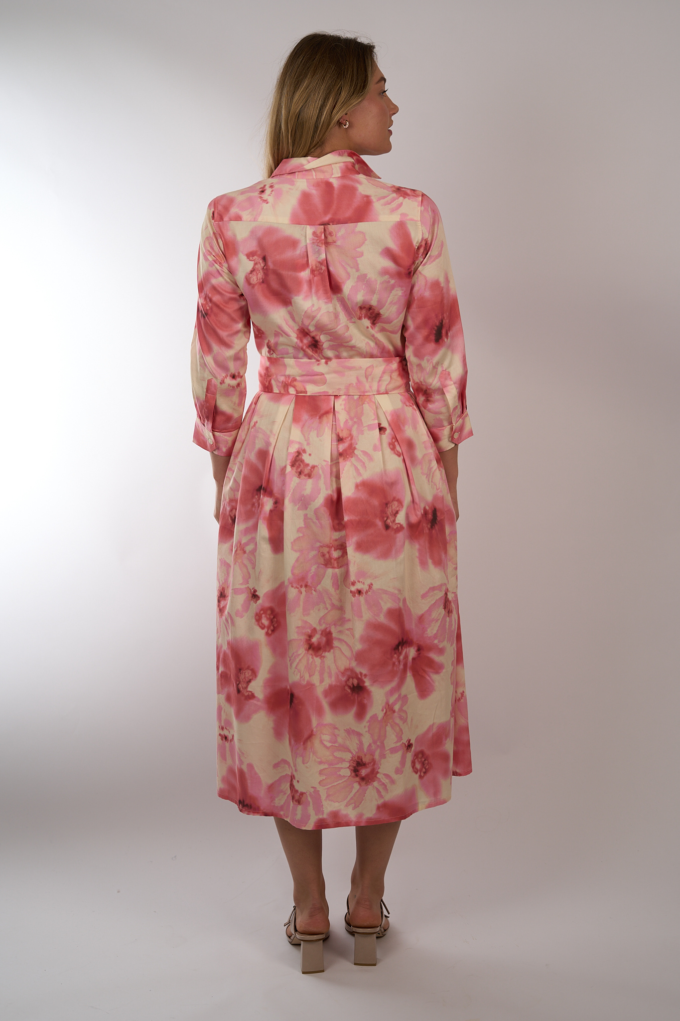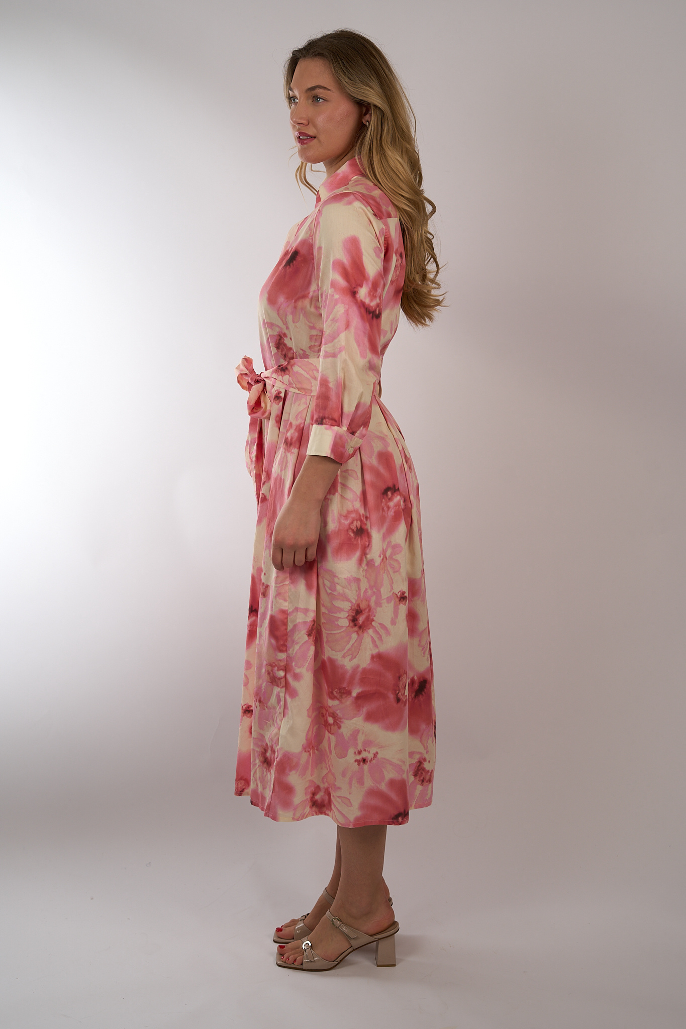 Midi jurk van 0039 Italy in een bloem dessin met een kraag, een doorlopende knoopsluiting en driekwart mouwen. De jurk is voorzien van een ceintuur rond de taille.