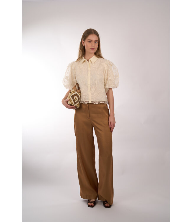 Deze soepelvallende broek van Aaiko is uitgevoerd in een glanzende stof. Voorzien van een hoge tailleband met riemlussen en een wijde, rechte pijp.