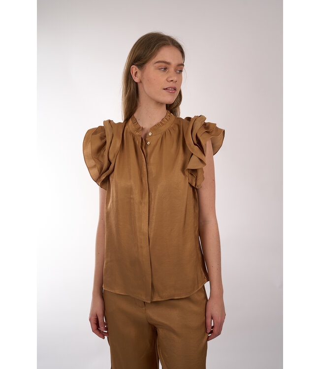 Rechte top van Aaiko uitgevoerd in een soepelvallende stof met subtiele glans. Het model is afgewerkt met een opstaande kraag, ruches op de schouders en een blinde knoopsluiting.
