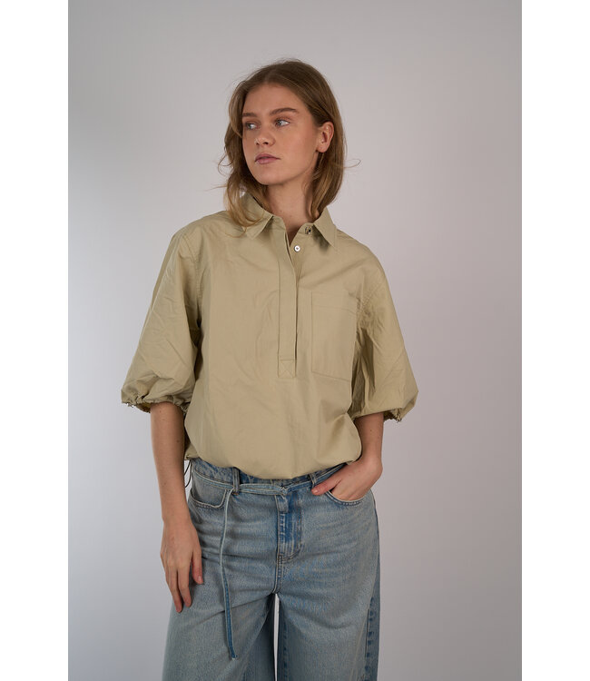 Poplin blouse van Aaiko met pofmouwen en een elastische zoom. Het model heeft een losse pasvorm en recht silhouet. Voorzien van een kraag, korte knoopsluiting en opgestikte zak. Losse pasvorm met rechte snit Lees meer.