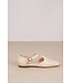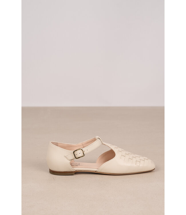 Een lage platte schoen van glad leer met een gevlochten patroon op de neus. Het model heeft een gesloten voorkant en open zijkanten met een bandje over de wreef en een gesp aan de zijkant. De lederen zool is dun en lichtbruin, met een kleine hak.