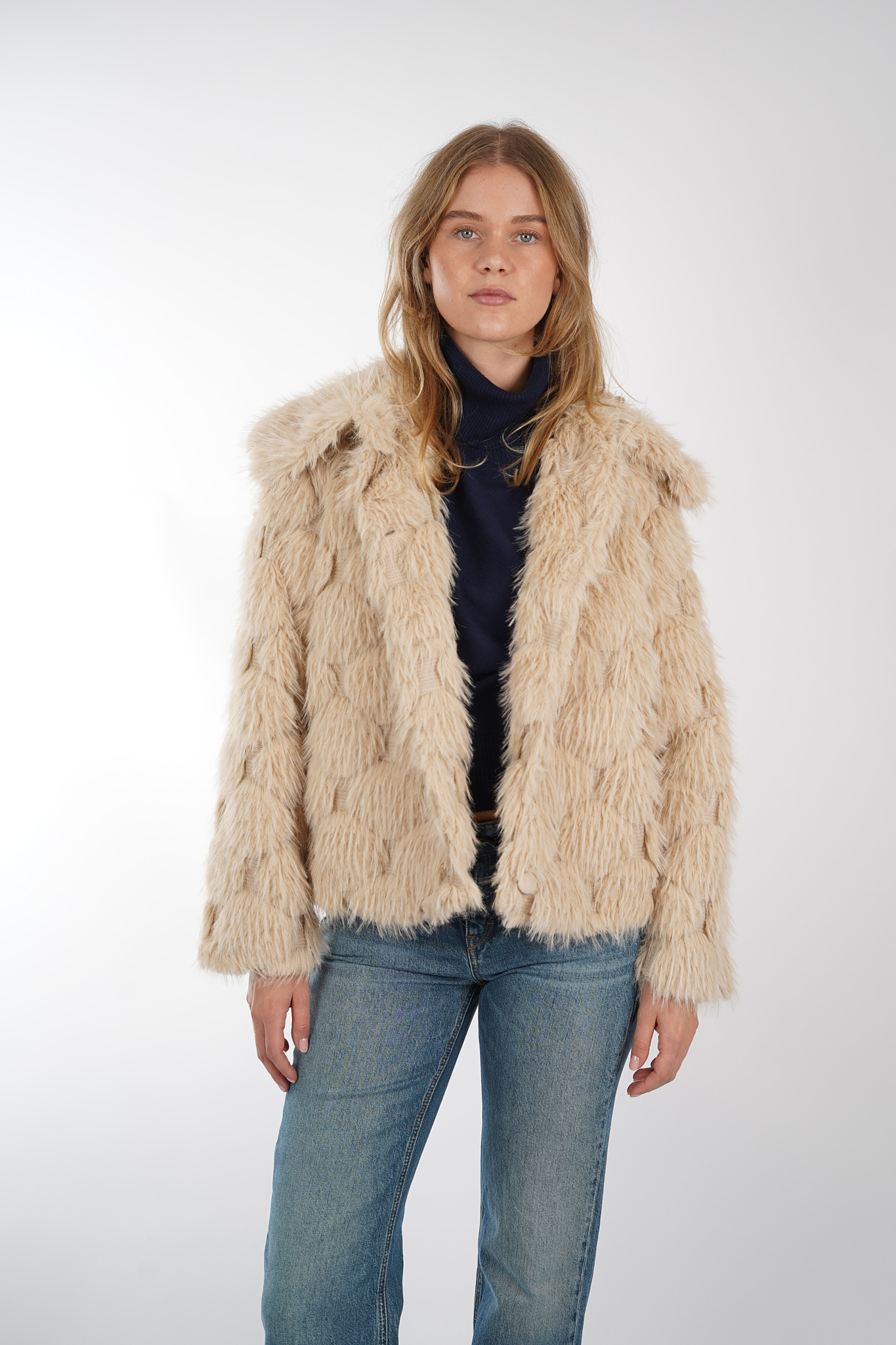 Fake fur jas van Aimee the Label, uitgevoerd met een stijlvolle knoopsluiting middenvoor, handige steekzakken aan de zijkanten en een opvallende, brede kraag.