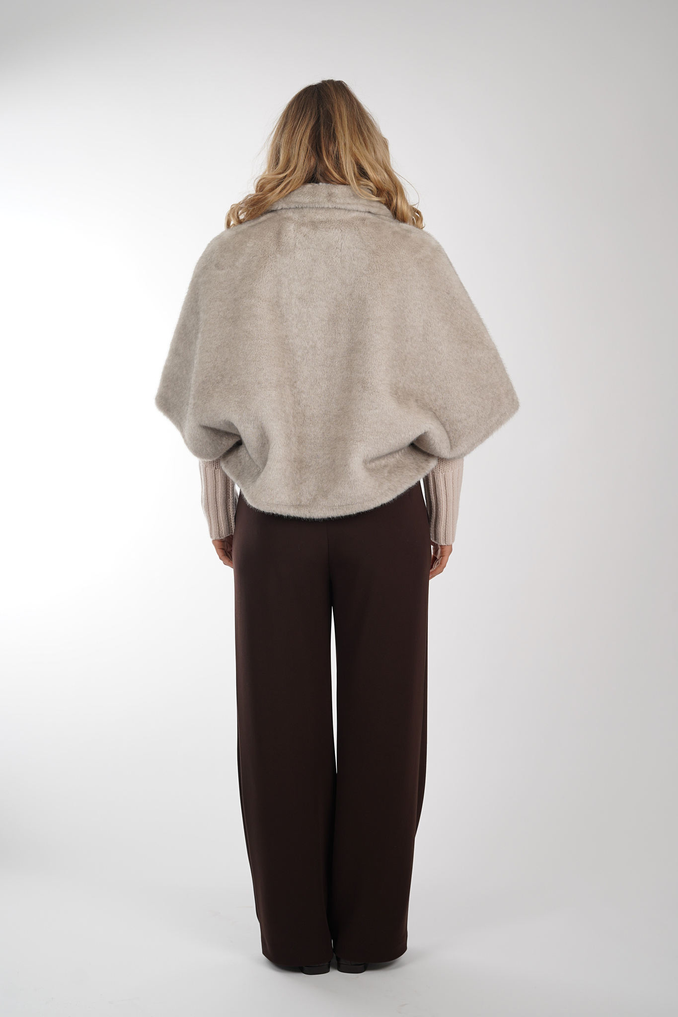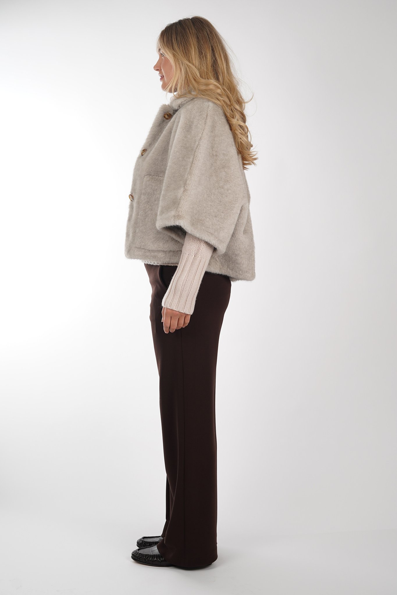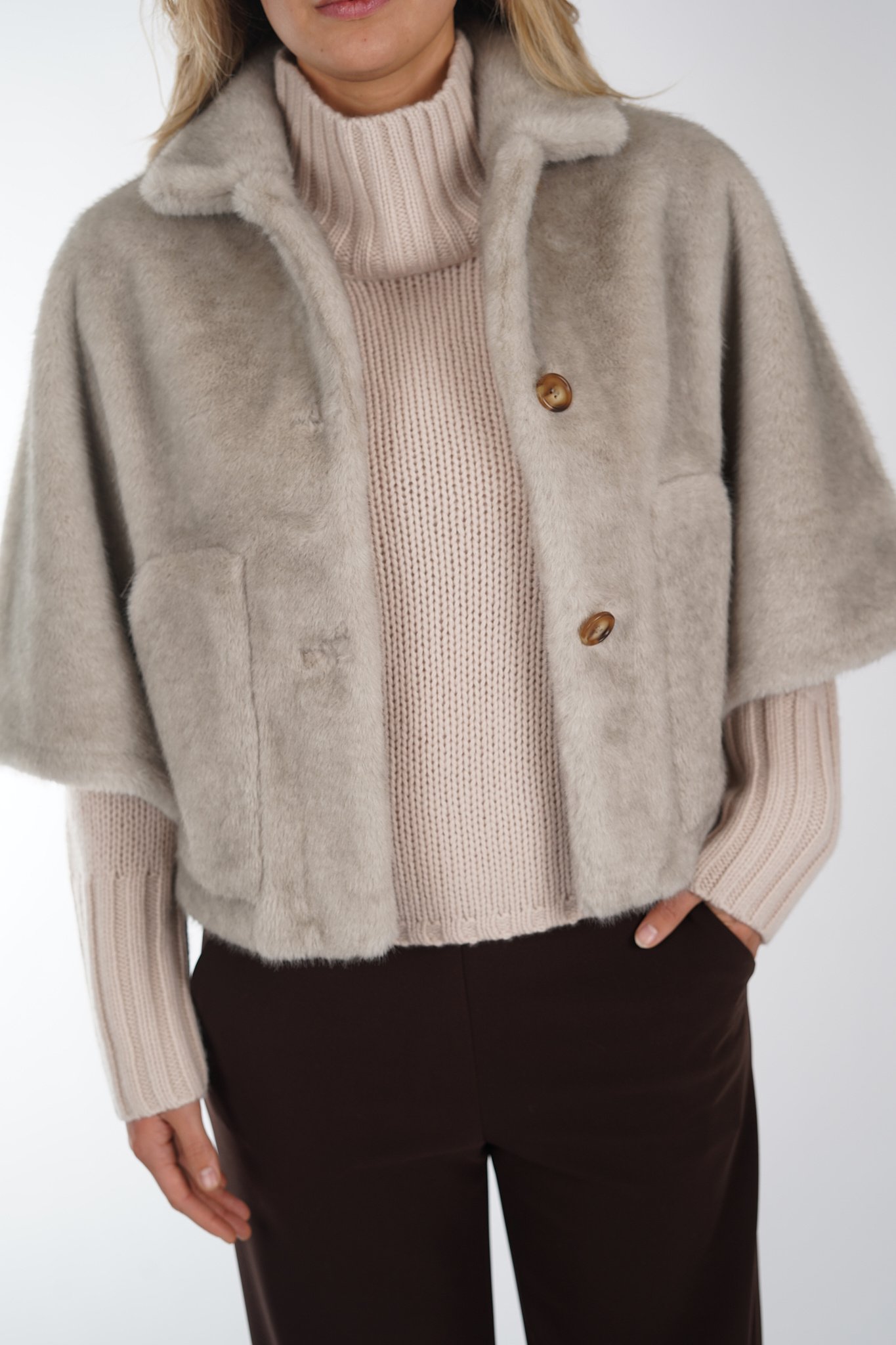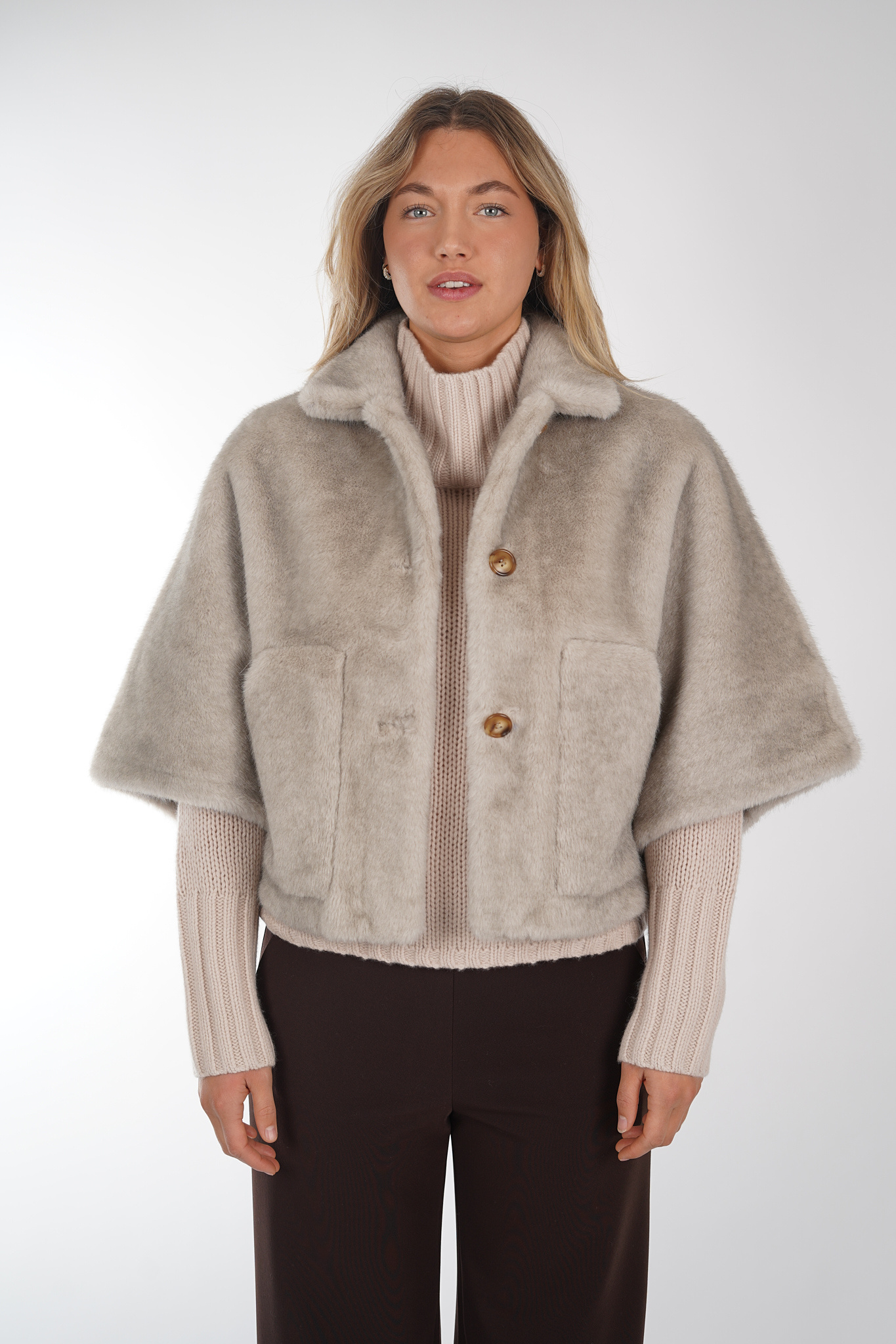 Jas van Alter Ego in cape model uitgevoerd in een taupe kleur. De jas heeft een kraag, driekwart mouwen, sluit door middel van een knoopsluiting en is voorzien van steekzakken.