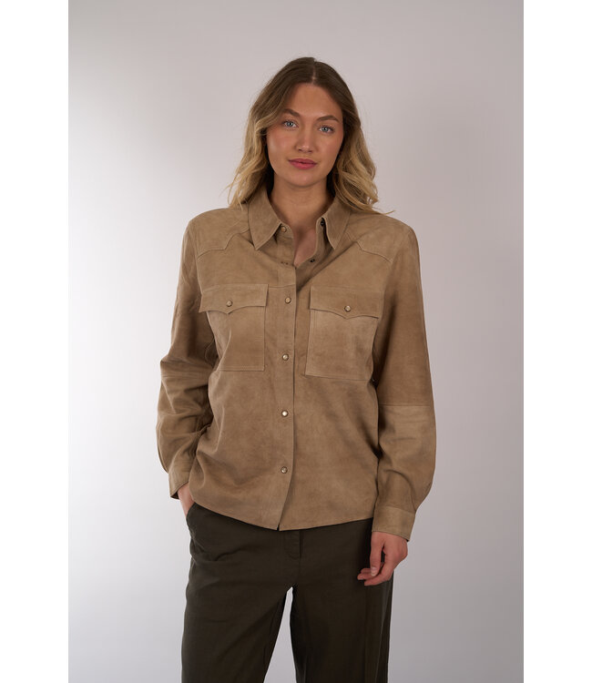 Jas van Alter Ego gemaakt van een suède, heeft een kraag, een druk- knoopsluiting en borstzakken met klep op de voorzijde. Het jasje draagt los vallend.