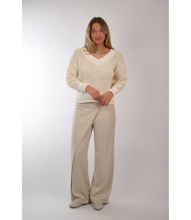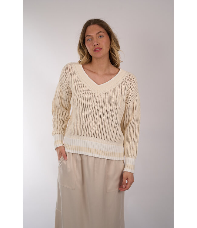 Grof gebreide trui van Anne Claire met lichte streepdetails rondom de mouwen en taille en een V-hals. Lees meer.