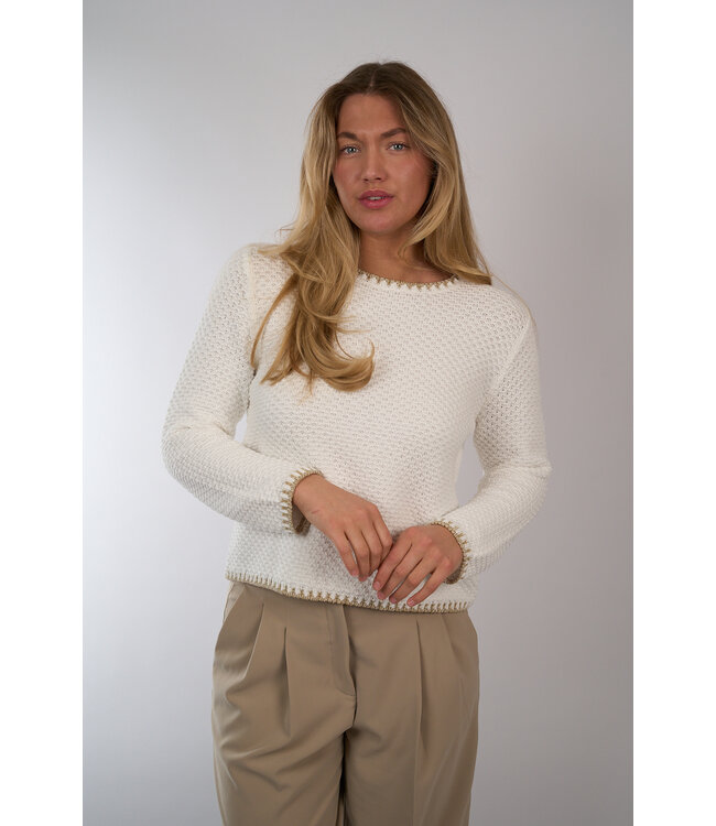 Trui van Anne Claire met verfijnde details rondom de kraag en mouwen en een grof geweven structuur. Lees meer.