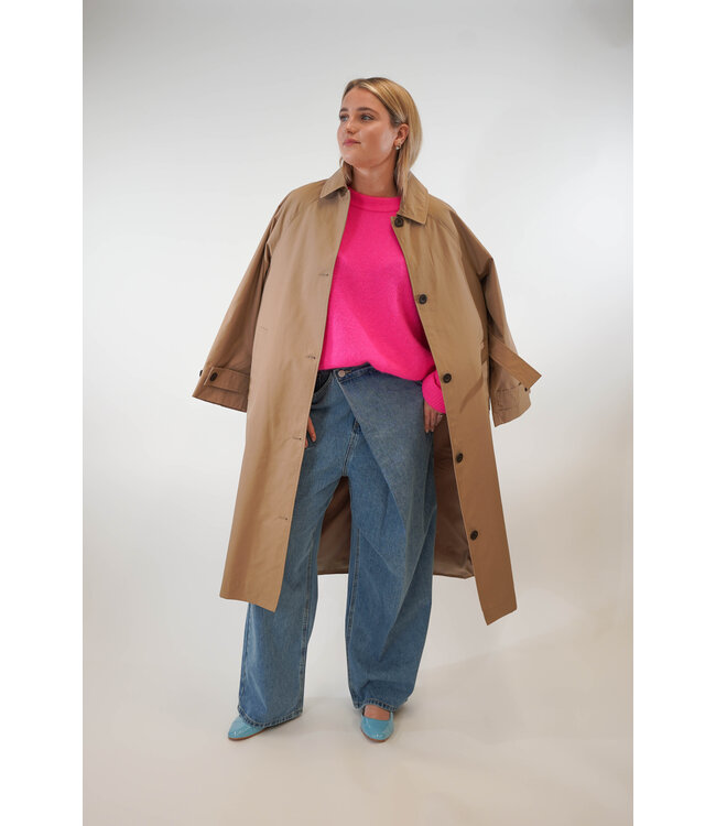 De wijdvallende jas van BASIC APPAREL heeft een losse riem in de taille en wordt gesloten met knoopsluiting. De manchet is voorzien van twee knopen voor het strakker maken van de mouw. De jas heeft twee steekzakken en een split midden achter .