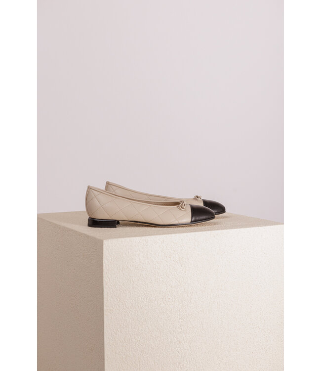Ballerina van Brunate. De ballerina heeft een doorgestikt padded patroon met een gladde neus en een strik detail. De hak heeft een hoogte van 1 cm en het voetbed is licht opgevuld.