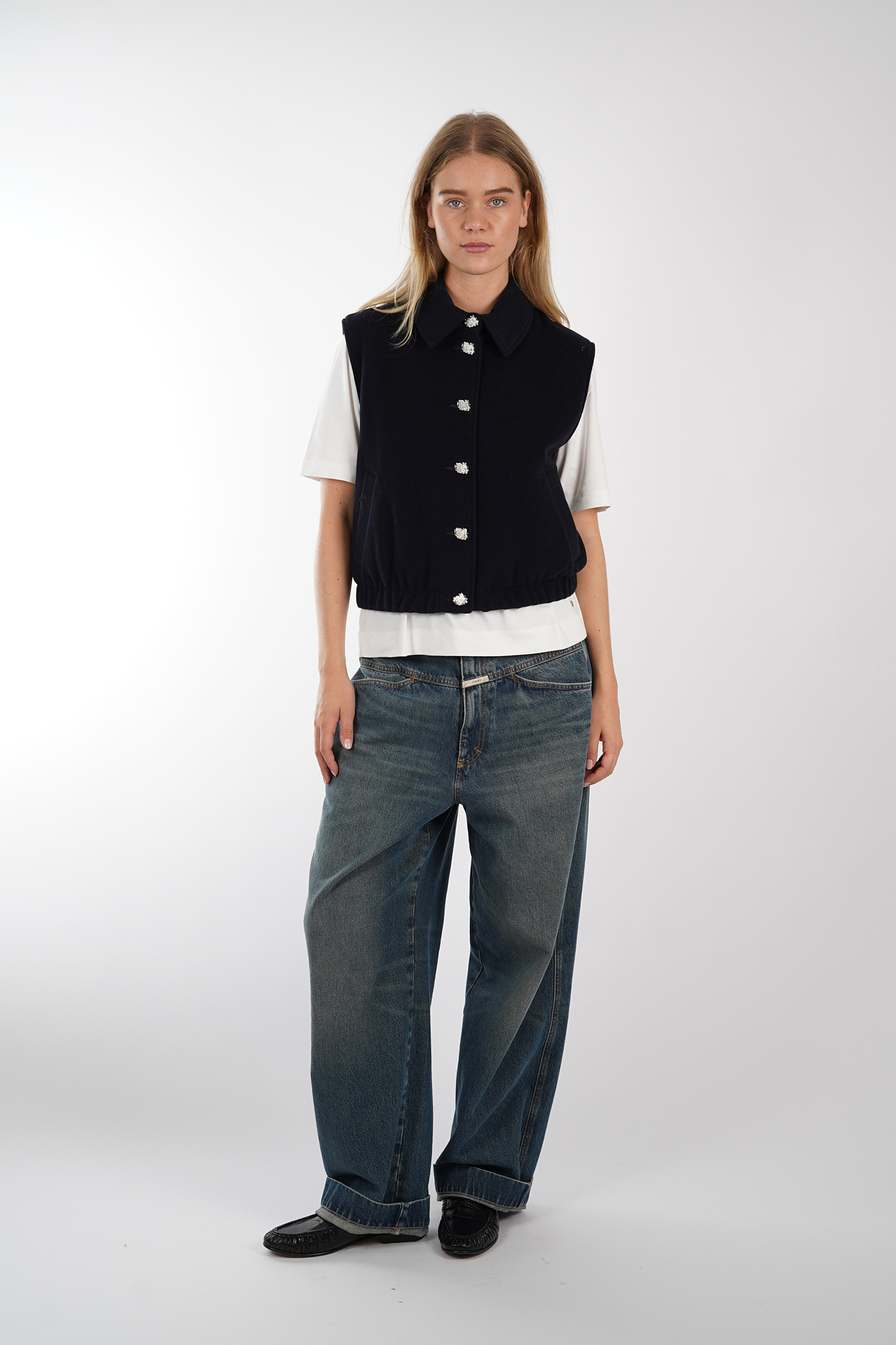 Gilet van Caroline Biss met bomber model. DIt gilet heeft een kraag, knoopsluiting, steekzakken en is elastisch bij de zoom.