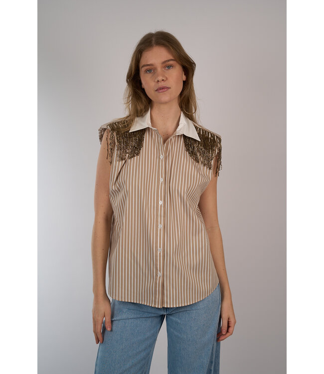 Mouwloze blouse van Dante6 met kraalfranjes. Een kraag met knoopsluiting, afneembare schoudervulling en ontworpen in een rechte pasvorm. Lees meer.