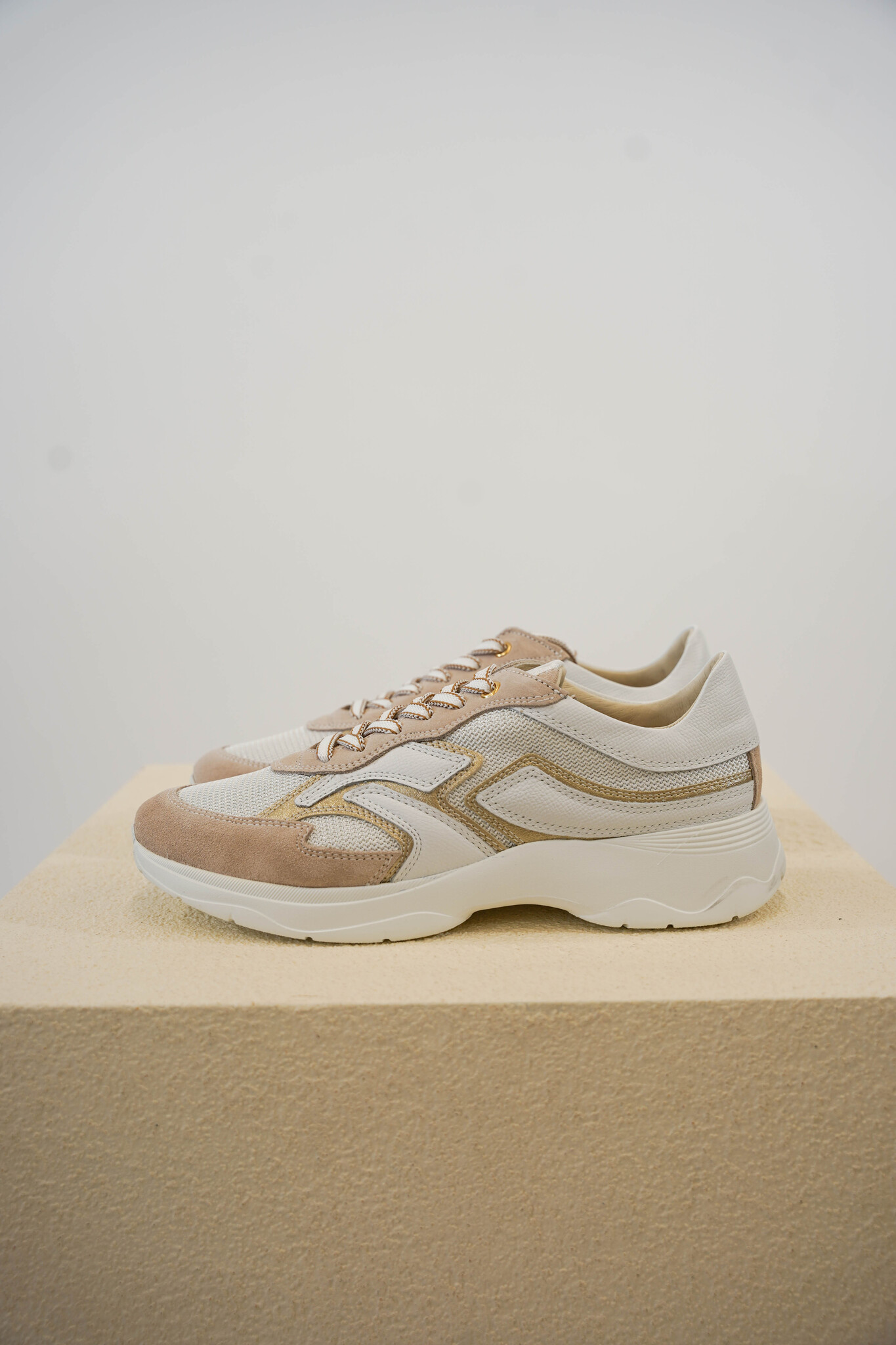 Deze sneakers van DL SPORT zijn uitgevoerd in mesh met gouden en suéde details. Het model heeft een vetersluiting, chunky zool en uitneembaar voetbed.
