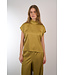 Top van Drykorn. Deze glanzende top met opstaande kraag is netjes afgewerkt met knopen aan de achterzijde. De top heeft aan beide zijden een lichte split en is langer aan de achterzijde.