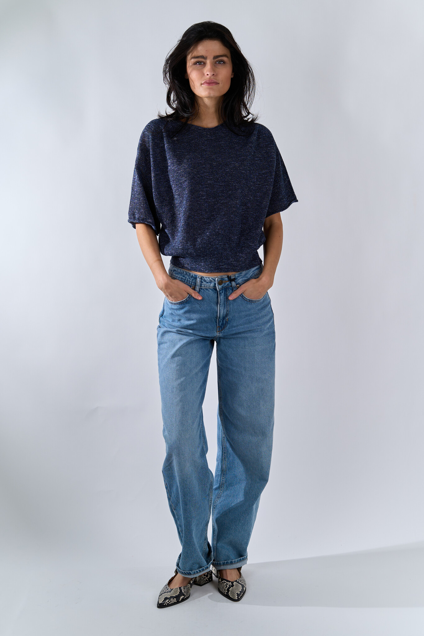 Top van Drykorn. Deze top heeft een ronde hals, halflange mouwen en elastische band aan de onderzijde.