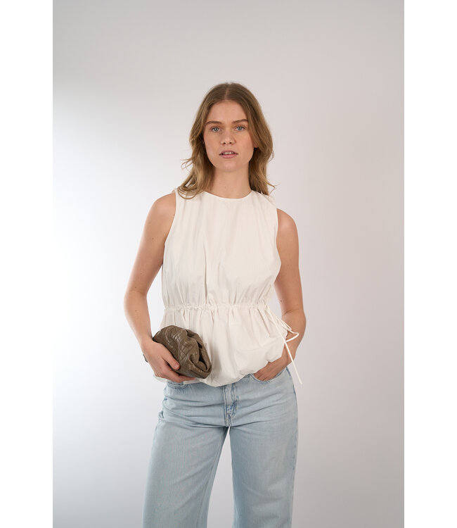 Mouwloze top van Eleh met trekkoord in de taille en gerimpelde zoom. Aan de achterzijde van de hals een knoopsluiting. Lees meer.