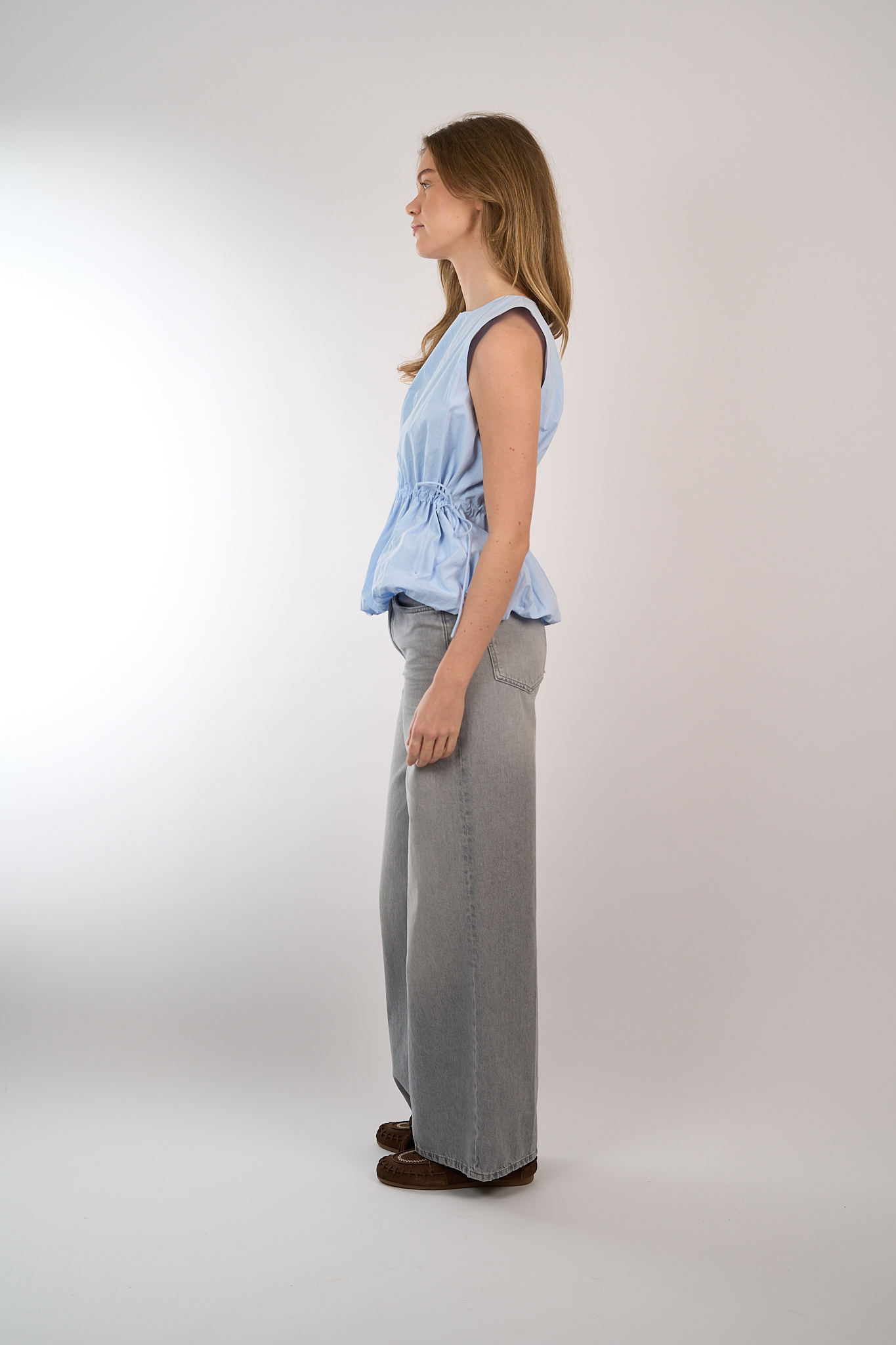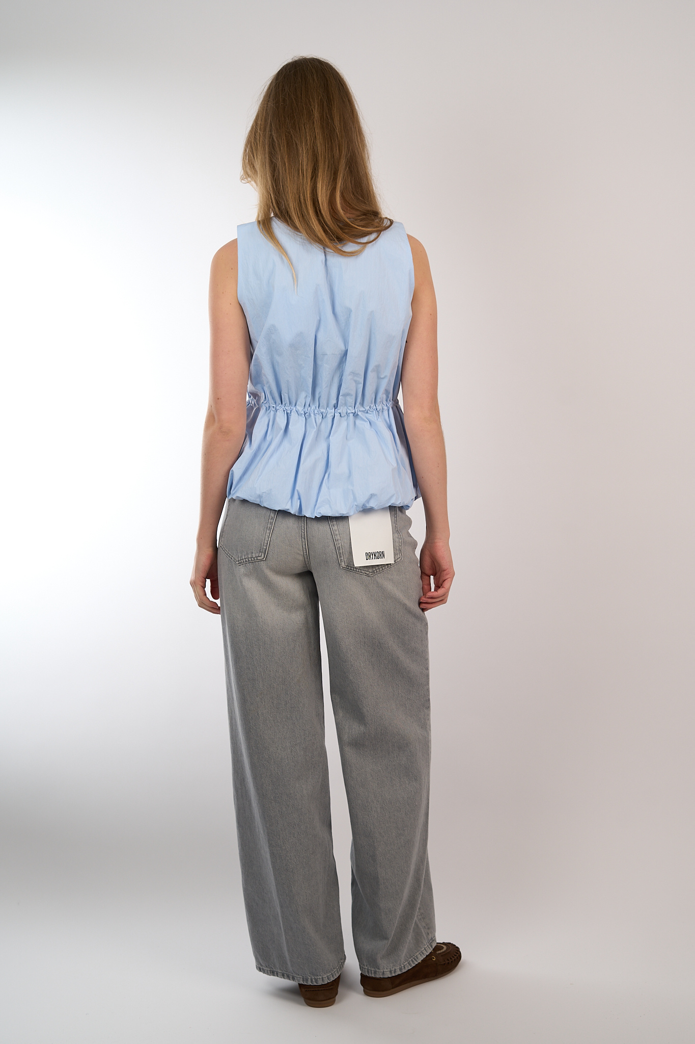 Mouwloze top van Eleh met trekkoord in de taille en gerimpelde zoom. Aan de achterzijde van de hals een knoopsluiting.