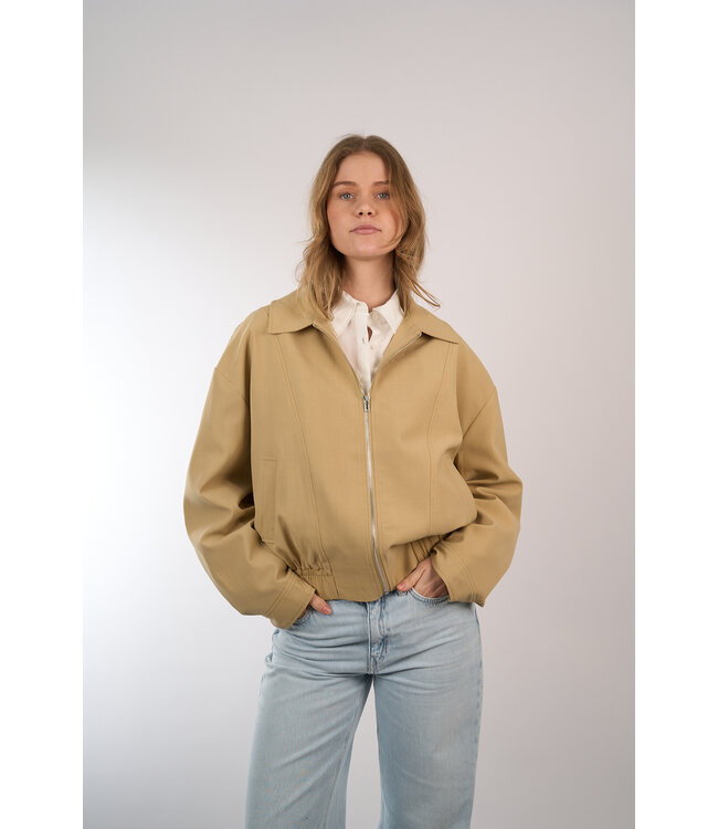 Bomber jack van Eleh met overhemdkraag en elastisch gerimpelde zoom. De jas valt oversized en is voorzien van een ritssluiting en steekzakken. Lees meer.