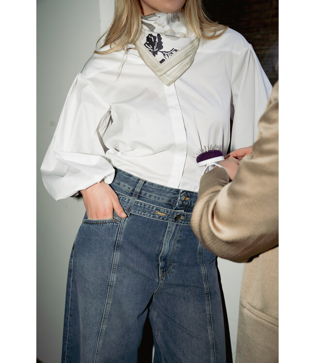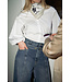Blouse van Emanou met opgestikt bloemen dessin. Voorzien van lange pofmouwen, een opstaande kraag en verborgen knoopsluiting. Lees meer.