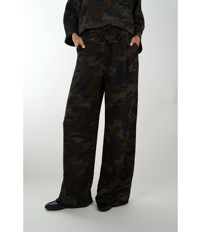 Wide leg pantalon van Essentiel Antwerp met een elastieke band. De pantalon is gemaakt met een structuur kwaliteit en heeft een subtiele army print.