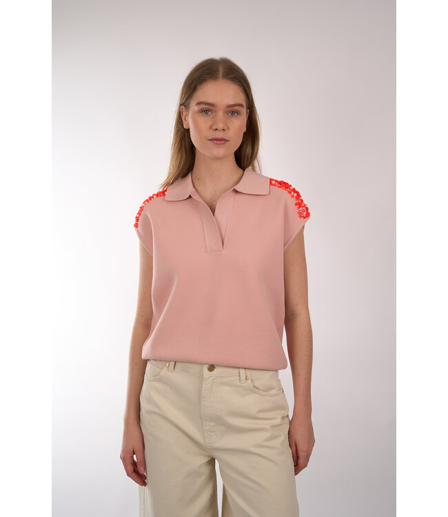 Mouwloze polo van Essentiel Antwerp in tricot met een relaxte pasvorm en een strak silhouet. Het ontwerp is versierd met borduurwerk van pailletten en kralen langs de schouders. Lees meer.