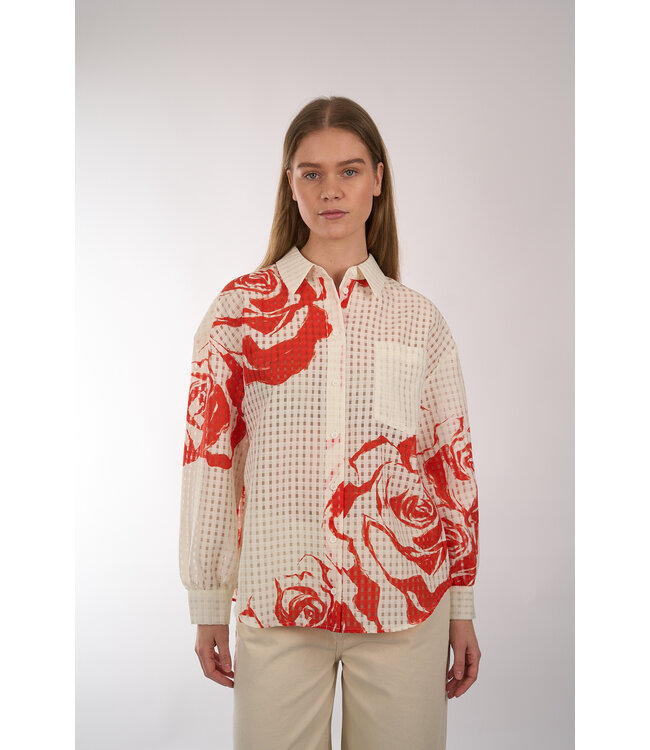 Oversized blouse van Essentiel Antwerp met een losvallend silhouet en een lage mouwinzet. De stof is opengewerkt en semi transparant. Het overhemd is voorzien van een knoopsluiting, borstzakken en een afgeronde zoom met langer achterpand.