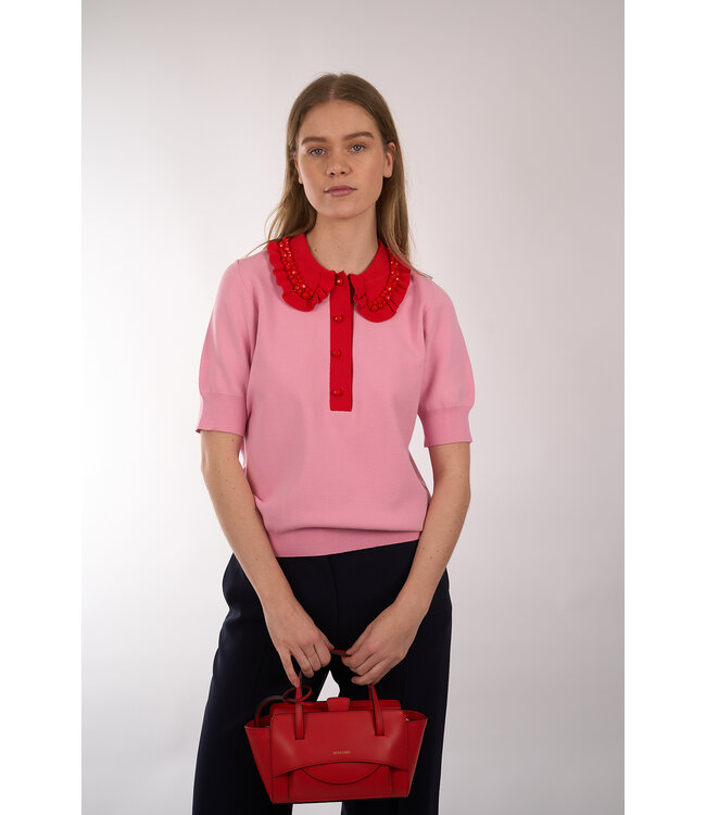 Polo van Essentiel Antwerp met relaxte pasvorm die smaller eindigt aan de heupen. De kraag is versierd met volant details en kralen. Lees meer.