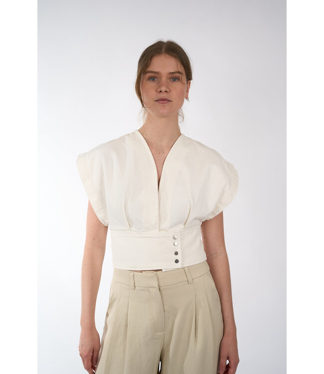 Top van EST'SEVEN met een V-hals, korte mouwen en een aangesloten tailleband met knopen. Lees meer.