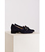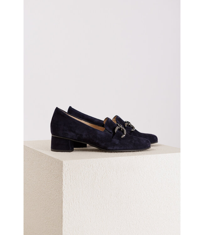 Loafers van Hassia. Deze klassieke loafer is gemaakt van een suede stof en heeft een hakje van 4,5 centimeter. De schoen heeft op de wreef een schakel ketting als detail.
