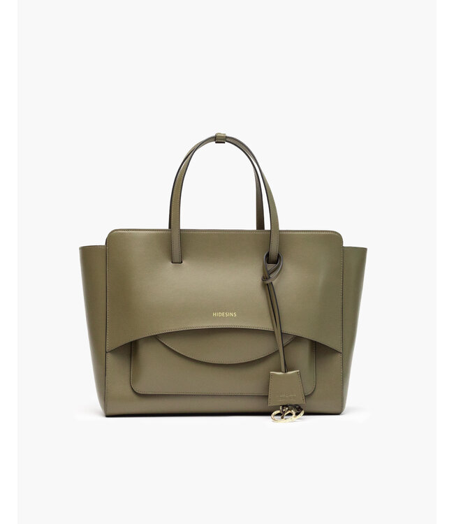 Dit ontwerp van HIDESINS is voorzien van een pouch genesteld in een van de handvatten. De tas heeft een magnetische sluiting, verstelbare en afneembare crossbody-riem, platte bodem, gouden details en is gevoerd van katoen met binnenzakken. Maat: L