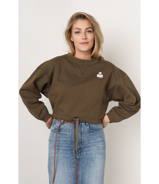 Sweater van Isabel Marant. Deze sweater heeft een hoge ronde halslijn en een lage mouwinzet wat zorgt voor een oversized pasvorm. De sweater heeft een kort model en is voorzien van een aan trek koord.