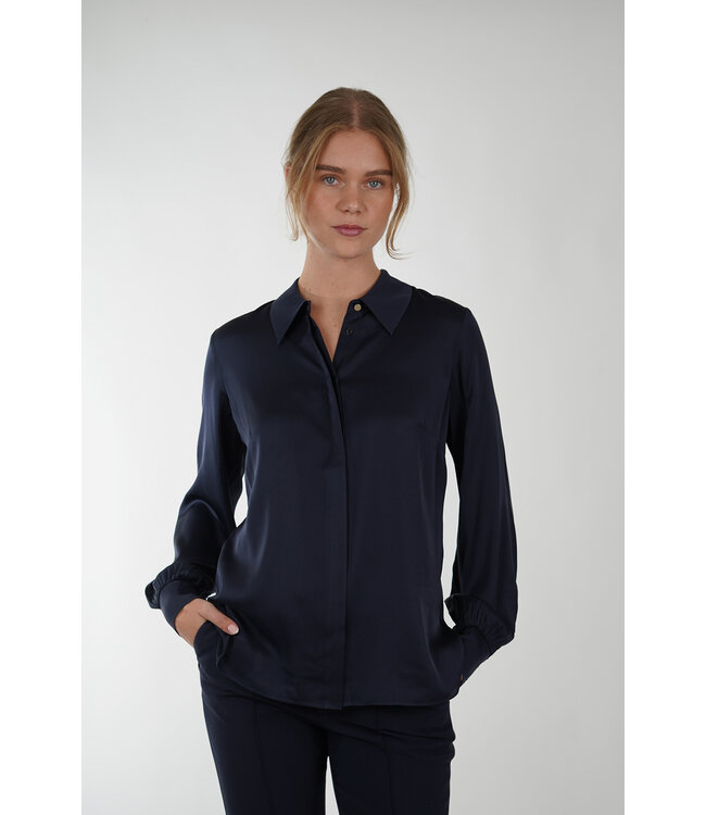 Zijde blouse van IVI met kraag en verborgen knoopsluiting. De manchetten zijn deels elastisch en sluiten met twee knoopjes. De blouse heeft een los vallende rechte pasvorm.