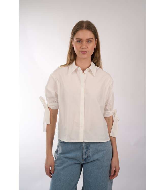 Blouse van JC Sophie met half lange pofmouwen door strikdetails op de manchetten. Voorzien van een kraag, verborgen knoopsluiting en een rechte pasvorm.