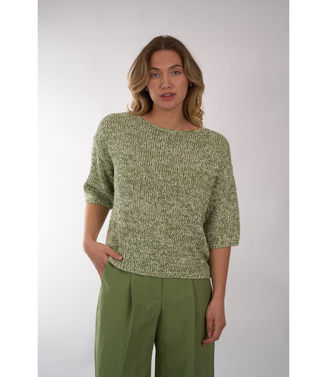 Een gebreide trui van Luisa Cerano van zomers, taps toelopend garen met een opengewerkt patroon, verlaagde schouders en halflange mouwen. De ronde halslijn is afgewerkt met een kabelbreipatroon.