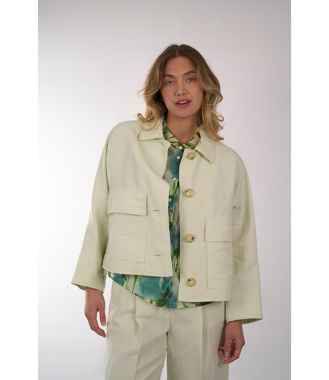 Jasje van Luisa Cerano in een pistache tint met een kraag, een knoopsluiting en opgestikte zakken met flap op het voorpand. Het jasje heeft een korter model en draagt oversized.