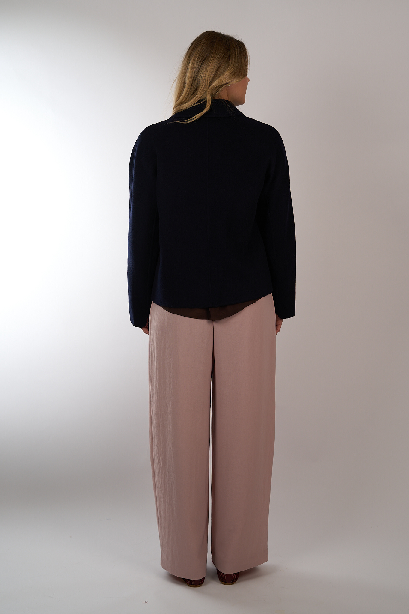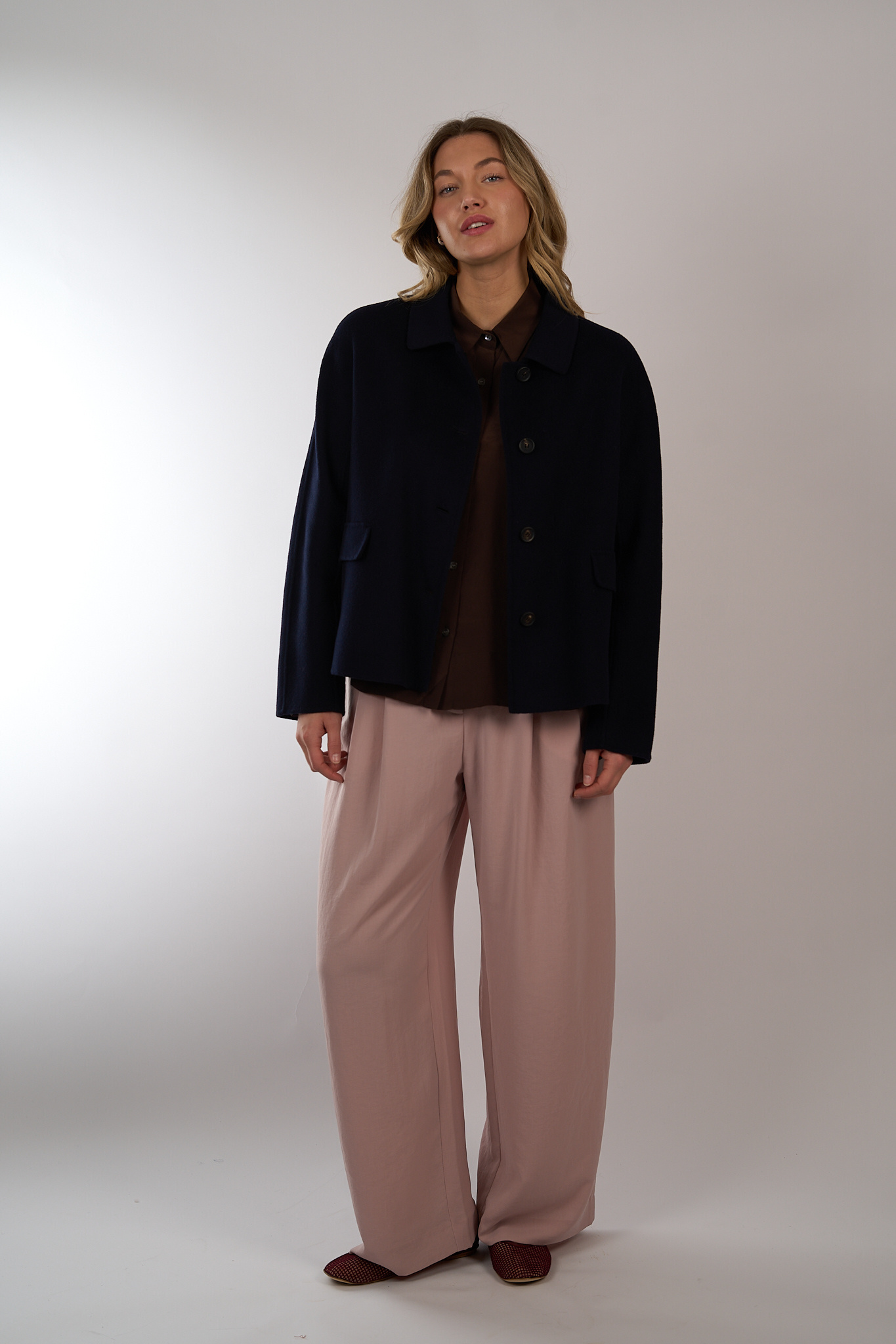 Wol jasje met rechte pasvorm van Mabrun. Voorzien van een kraag, knoopsluiting en steekzakken met klep. Afgeronde zoom en splitjes.