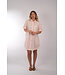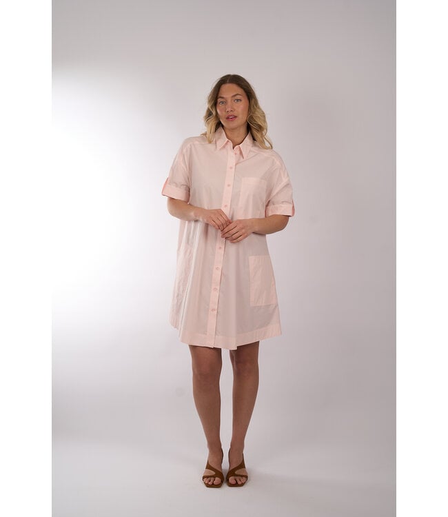 Jurk van MarcCain in een midi lengte met een kraag, een doorlopende knoopsluiting en een kort mouwtje. De jurk is een recht model en draagt los vallend.