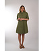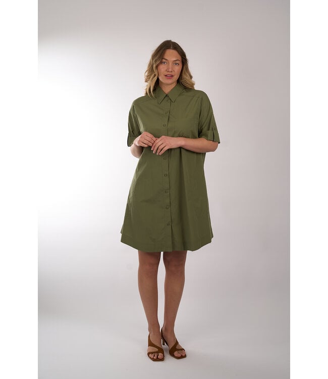Jurk van MarcCain in een midi lengte met een kraag, een doorlopende knoopsluiting en een kort mouwtje. De jurk is een recht model en draagt los vallend.