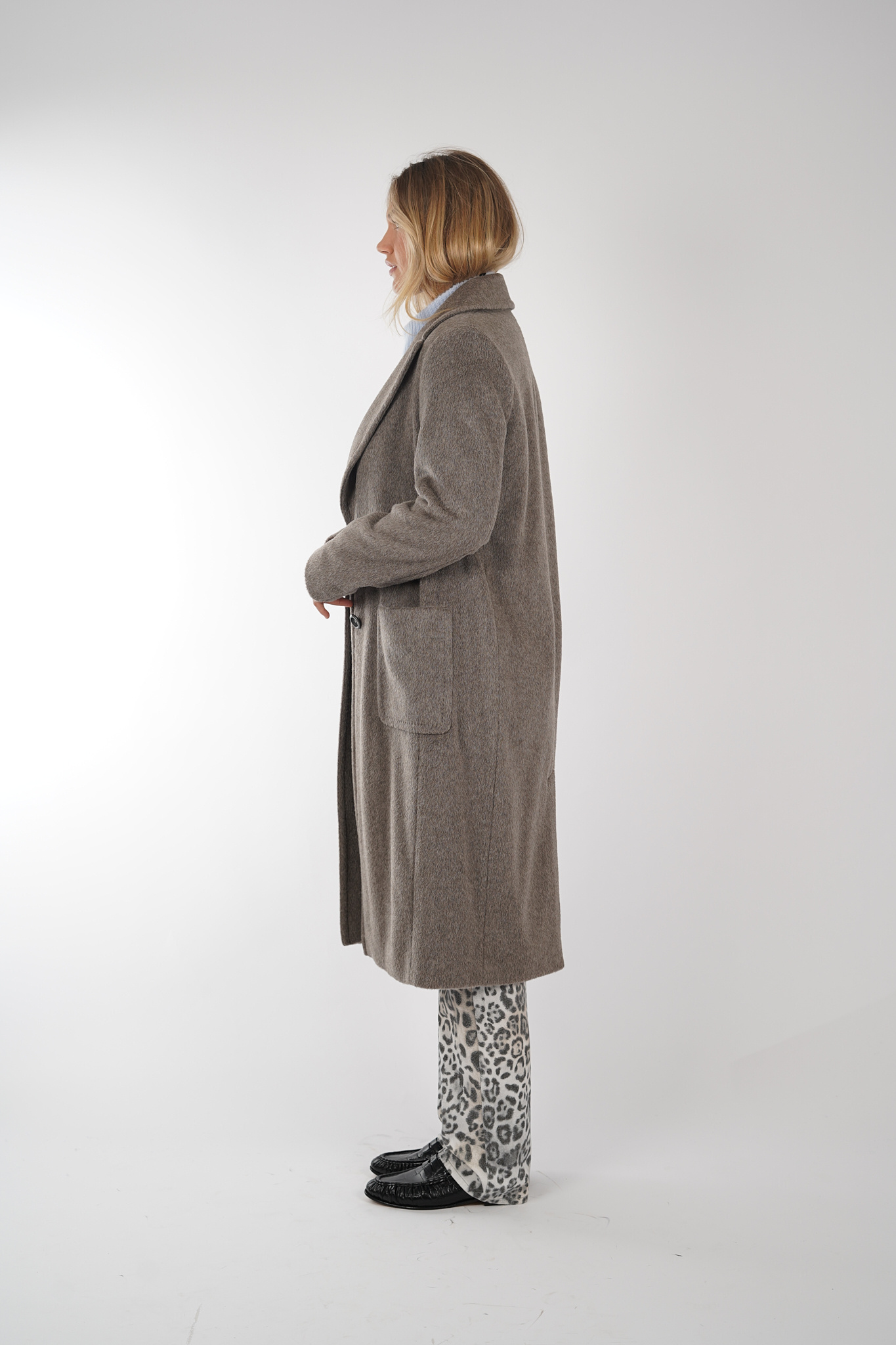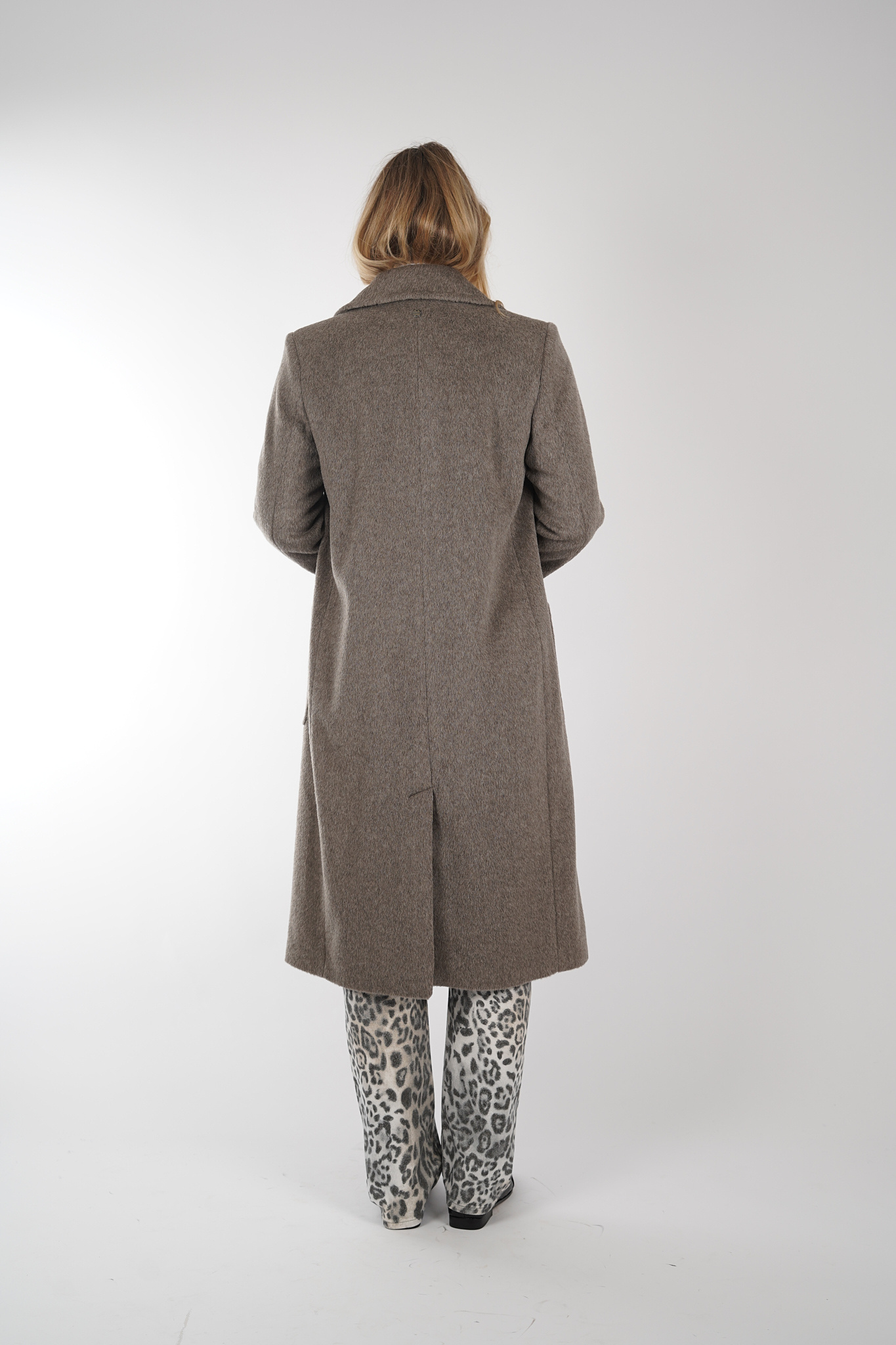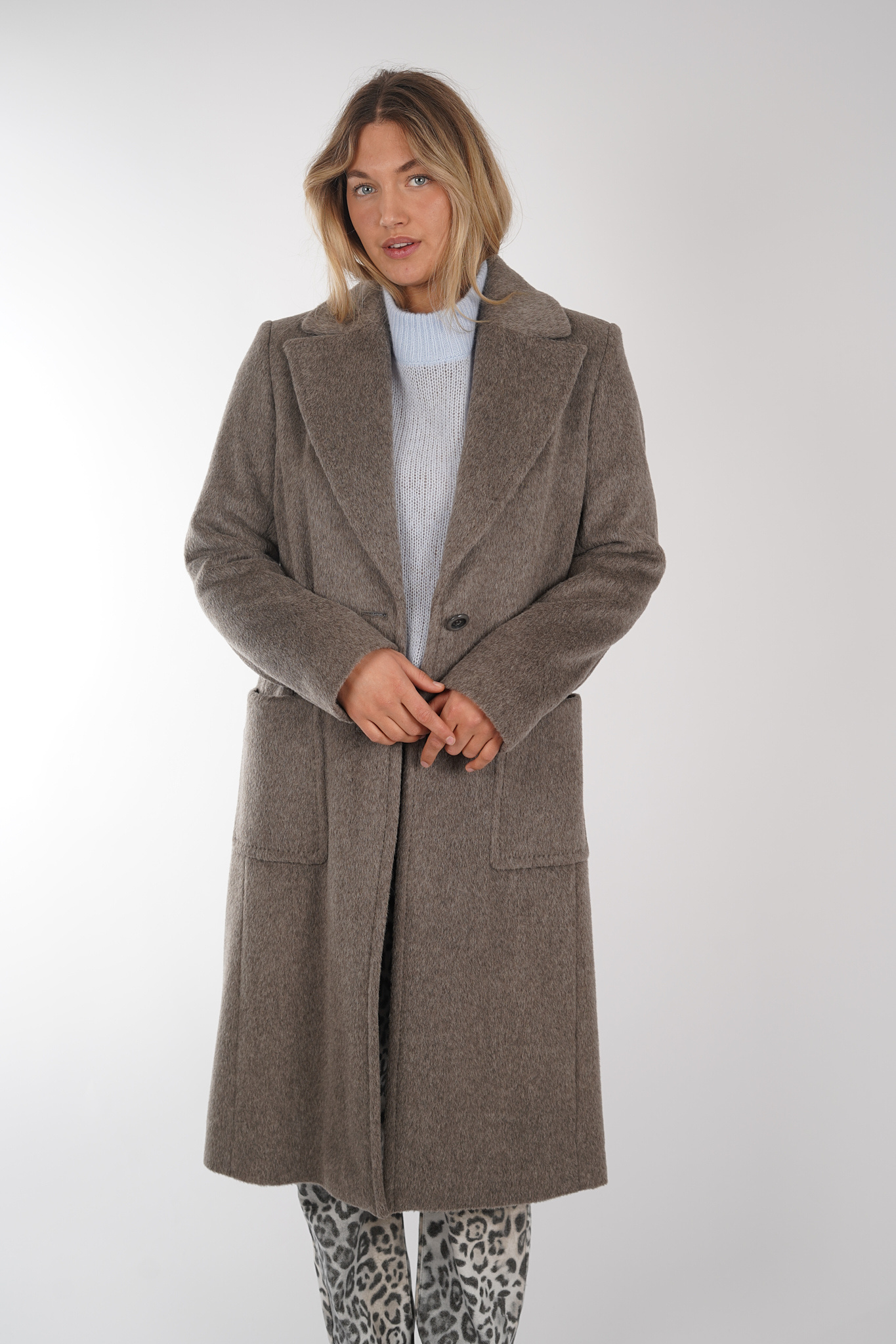 Lange mantel van MarcCain gemaakt van een mix van alpaca en scheerwol. De jas heeft een losse pasvorm met lange revers, grote opgestikte zakken en klassieke knoopsluiting