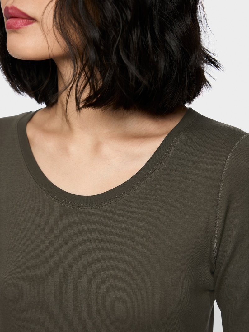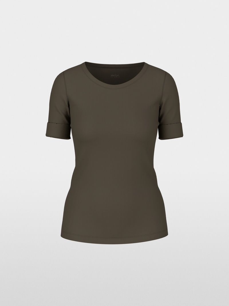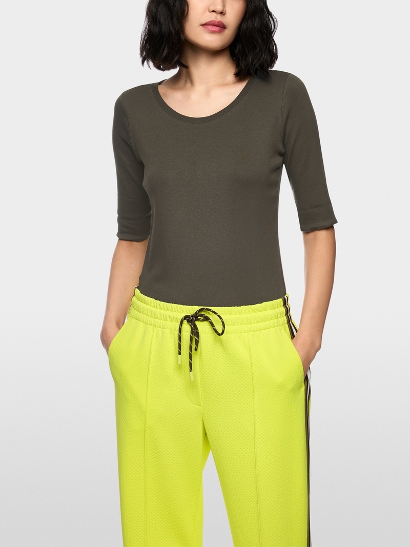 Smal gesneden basic shirt van Marc Cain van stretchkatoen voor perfect draagcomfort. Golvende mouwzomen zijn bijzondere details. De ronde halslijn en halflange mouwen maken de look af.
