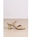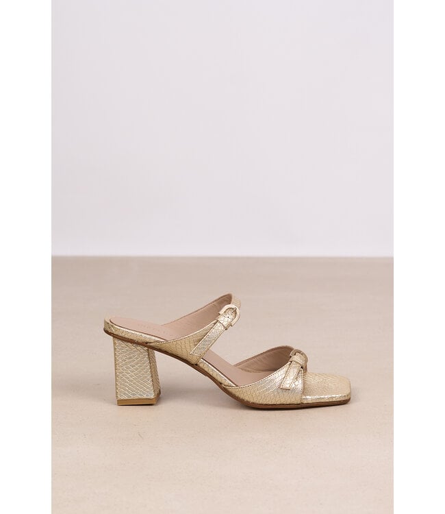 Sandaal van March23. De sandaal heeft een hoge hak, met een glanzende metallic gouden finish, een subtiel schubbenrelief en een elegante trechterhak . De verfijnde bandjes met gespjes maken deze sandaal perfect voor elk zomers feestje. Lees meer.