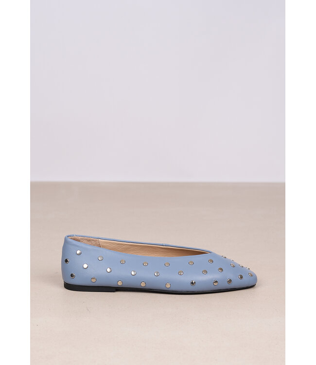 Deze lichtblauwe ballerina van March 23 in zacht leer is afgewerkt met subtiele zilverkleurige studs.