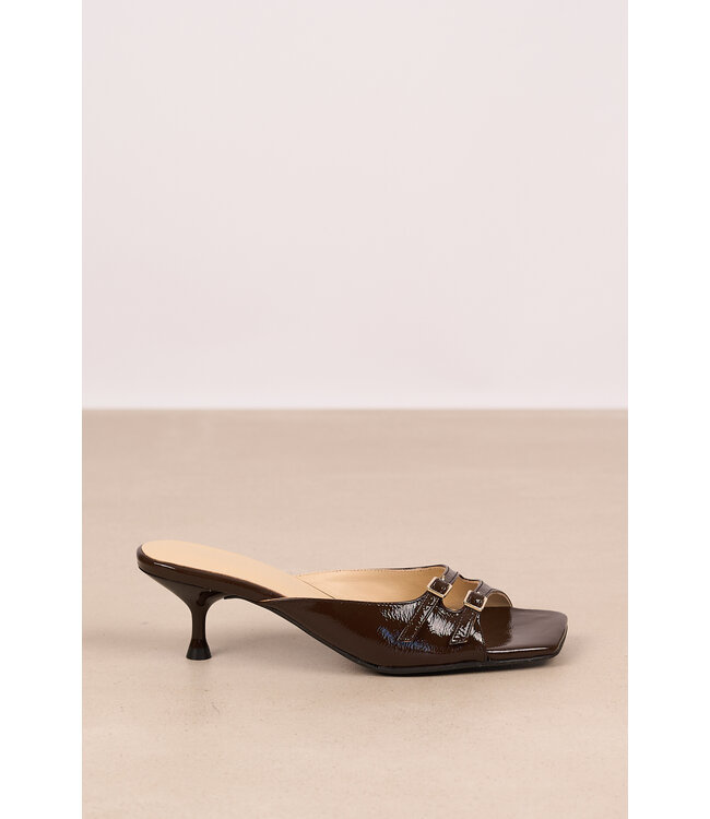 Sandaal van March23. De sandaal heeft een hoge hak, met een opvallende vierkante neus en twee verstelbare bandjes met zilveren gespen. De sandaal is volledig leer, met een donker bruin kleur. Lees meer.