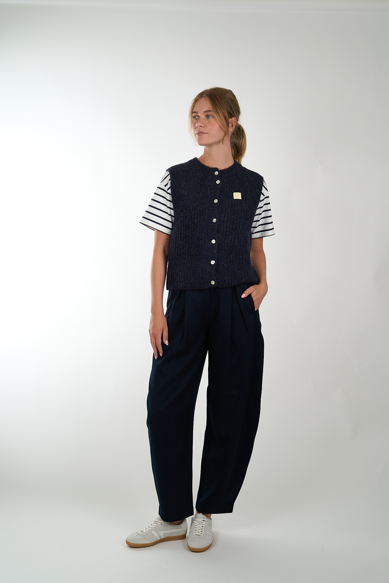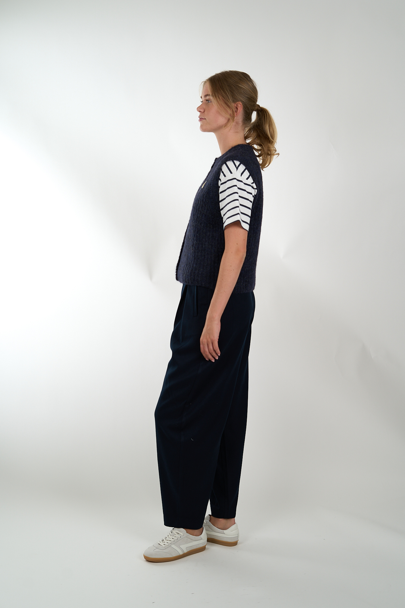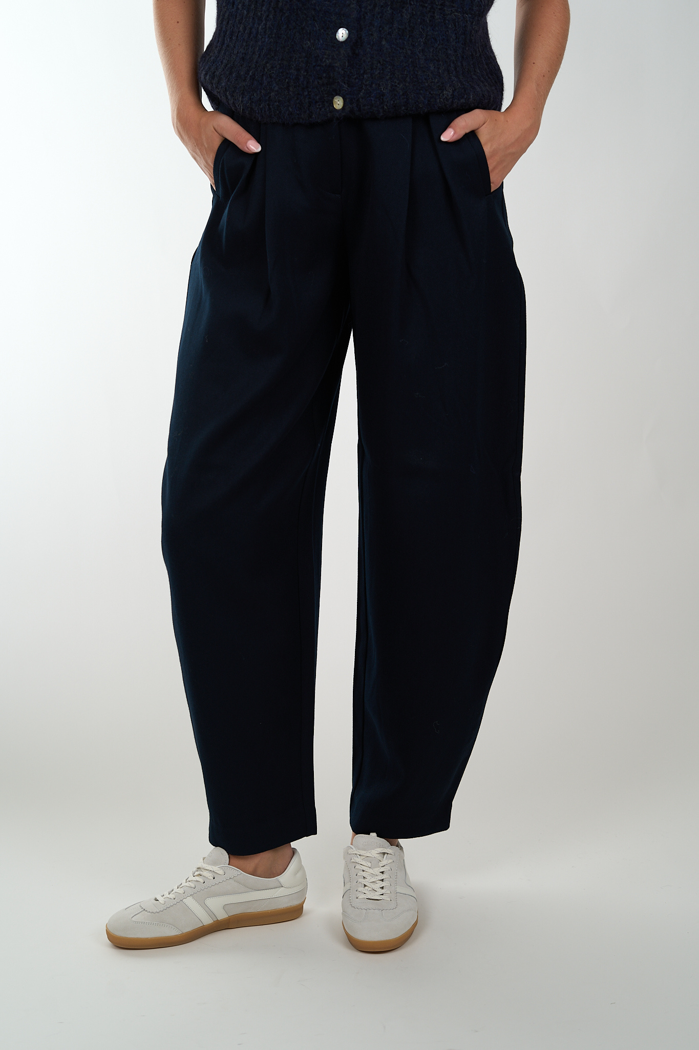 Leuke pantalon van MSCH COPENHAGEN met een barrel-fit en bandplooien heeft een diep donker blauwe kleur. De pantalon is gemaakt van een zachte viscose-wol mix waardoor hij erg soepel valt.