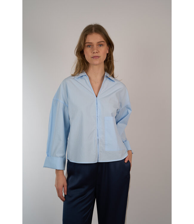 Boxy blouse van My Essential Wardrobe met een v-hals, kraag en lusjes knoopsluiting. Het model heeft een oversized pasvorm, wijde mouwen met brede manchet en een opgestikte zak. Lees meer.
