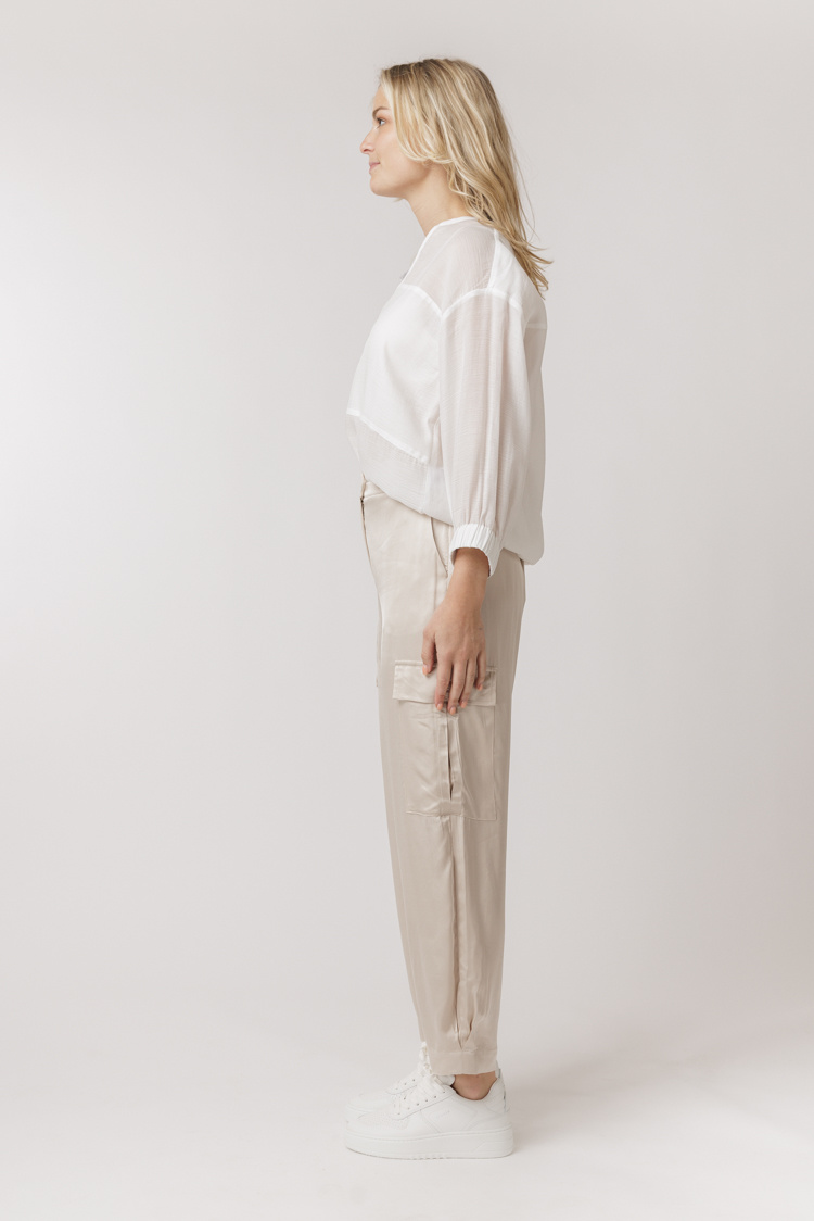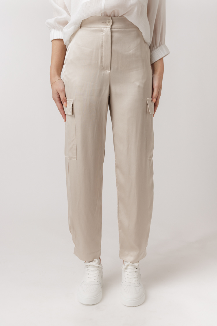 Broek van No Man's Land. Deze broek heeft een hoge taille, voorzien van riem lussen en een elastische band. De broek sluit door middel van een ritssluiting met knoop en heeft steekzakken. Het item heeft grove zakken wat zorgt voor een stoere look.