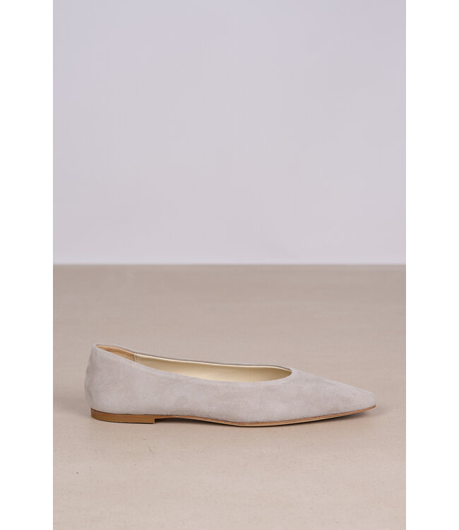 Lichtgrijze ballerina van Odare uitgevoerd in suède. Voorzien van een licht vierkante neus, lage instap en een platte zool.