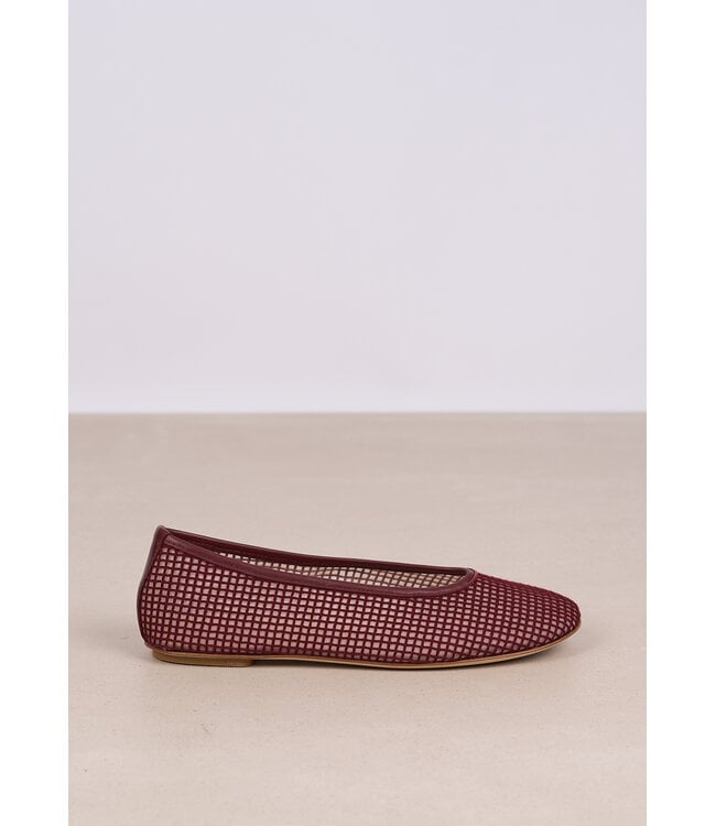Bordeauxrode ballerina van Odare met een open mesh-structuur. Voorzien van een ronde neus, een lage instap en een platte zool. Lees meer.