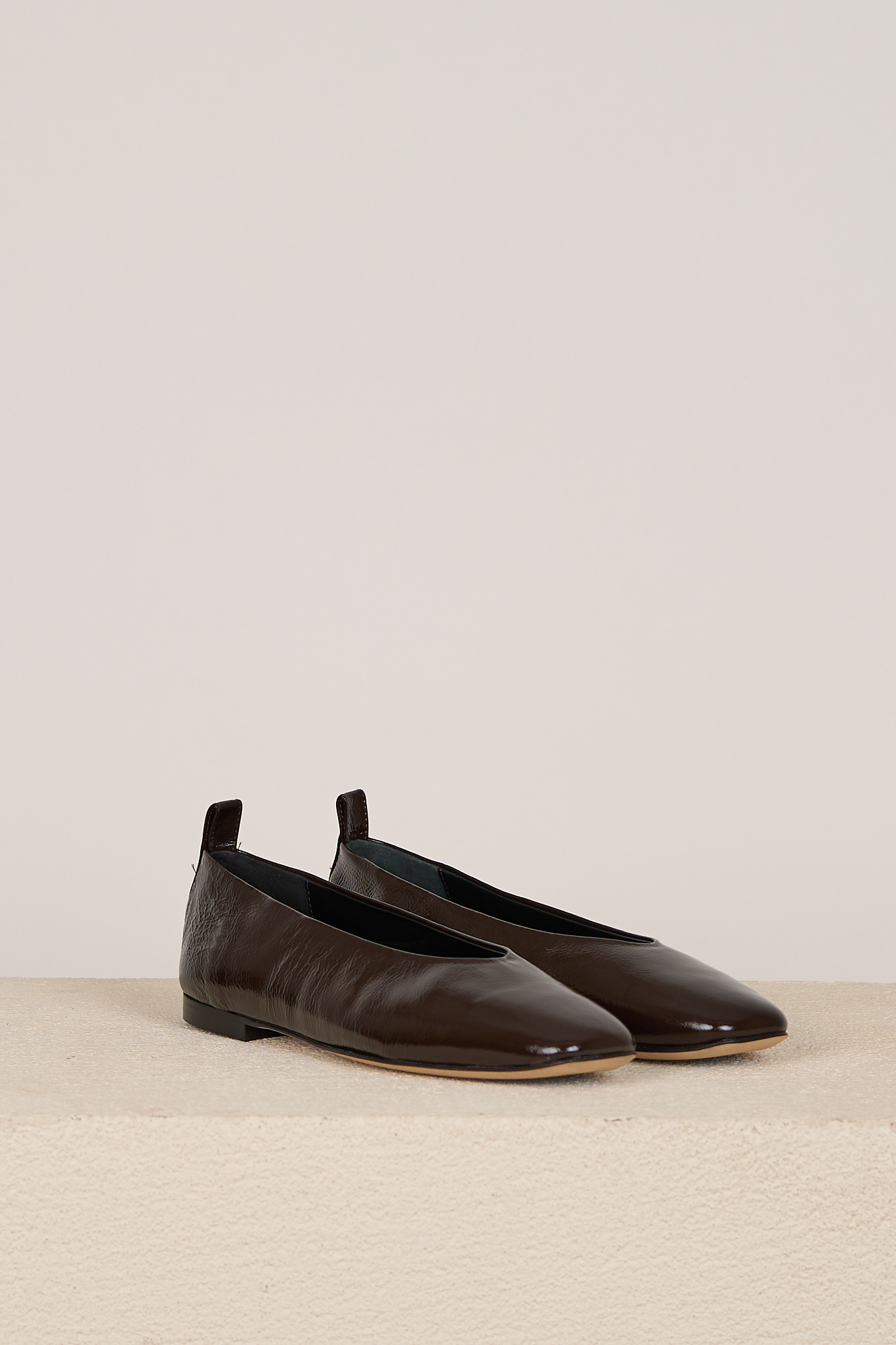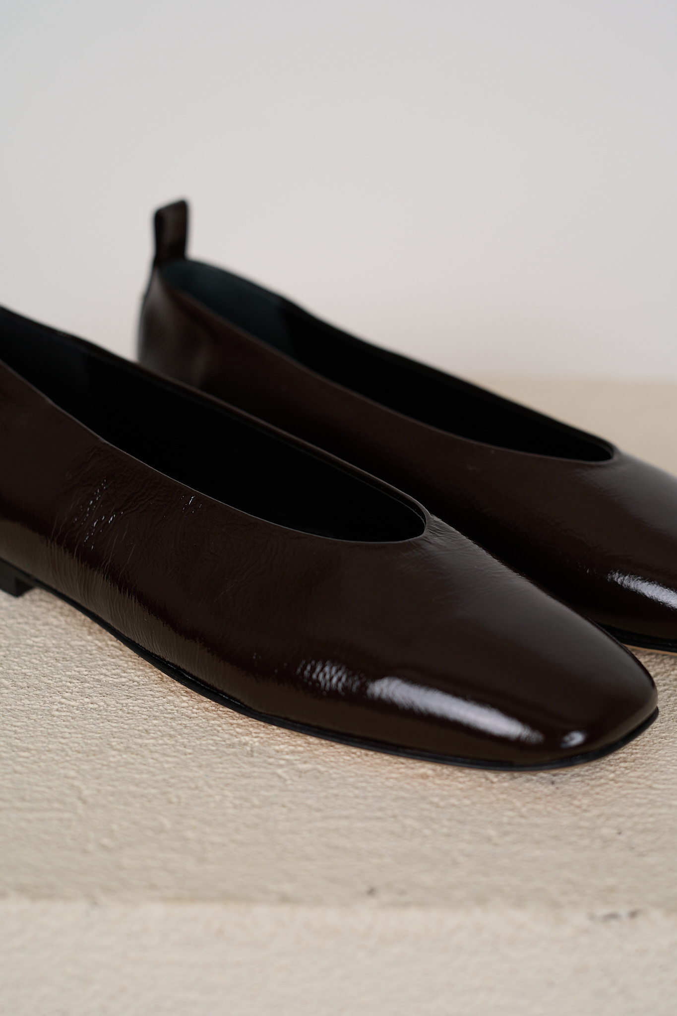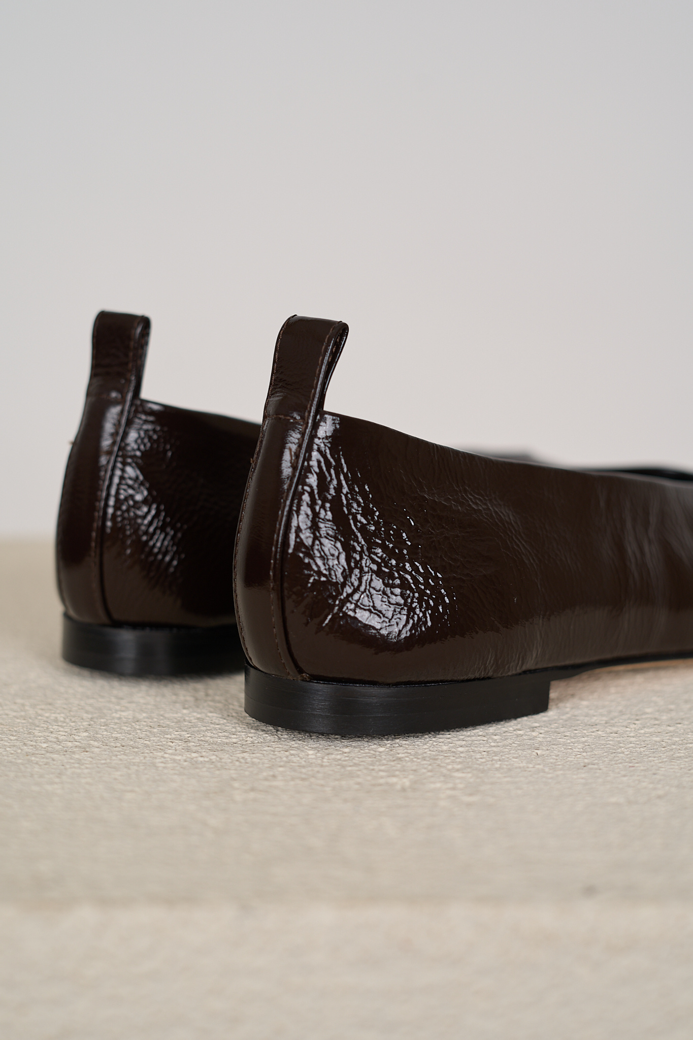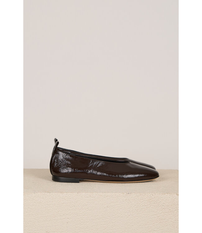 Deze ballerina's van ODARE zijn uitgevoerd in een bruine lakleer. De schoenen hebben een hakhoogte van 0,5 cm en de binnenzijde is bekleed met leer.