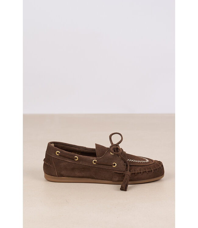 Deze loafers in bootstijl van POSA zijn gemaakt van vintage suède en zijn voorzien van kwastjes aan de veters en sierstiksels op de neus. Lees meer.