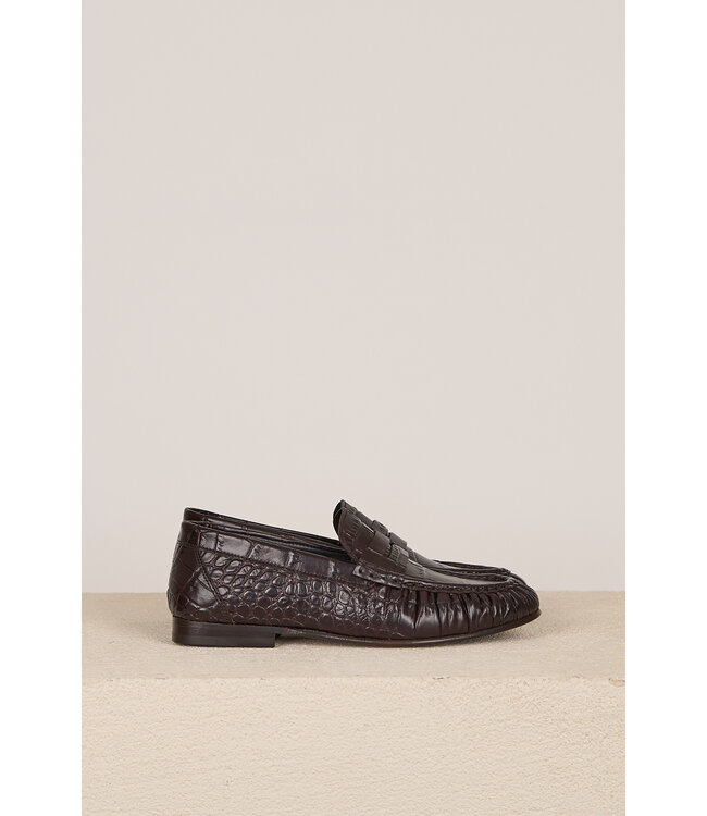 Deze loafers van POSA uitgevoerd in een zachte, amandelvormig model met rimpel in donkerbruin crocoleer.